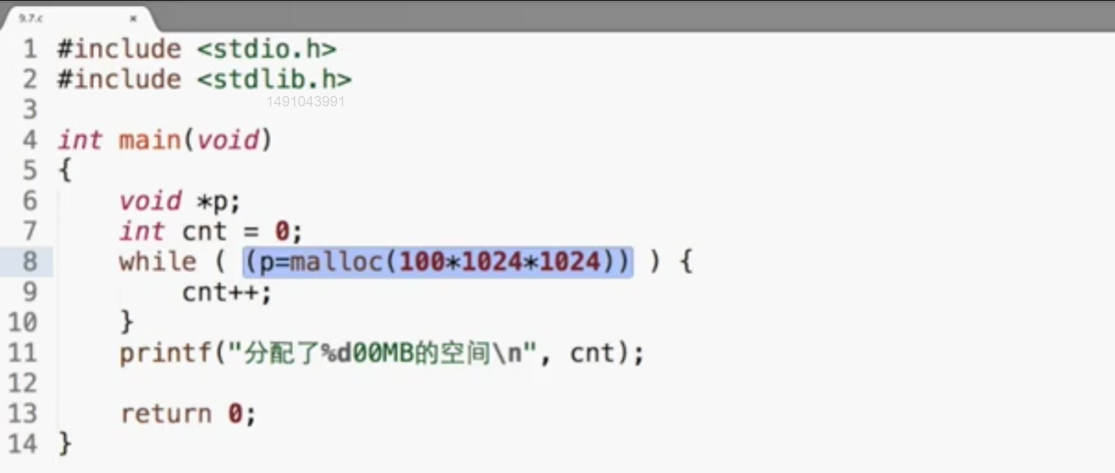 - 用malloc获取100MB内存空间,返回地址赋值给p