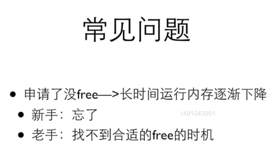 - malloc没有free, 残留内存垃圾,申请内存不释放,会造成内存泄漏,比如大型程序(服务器程序)