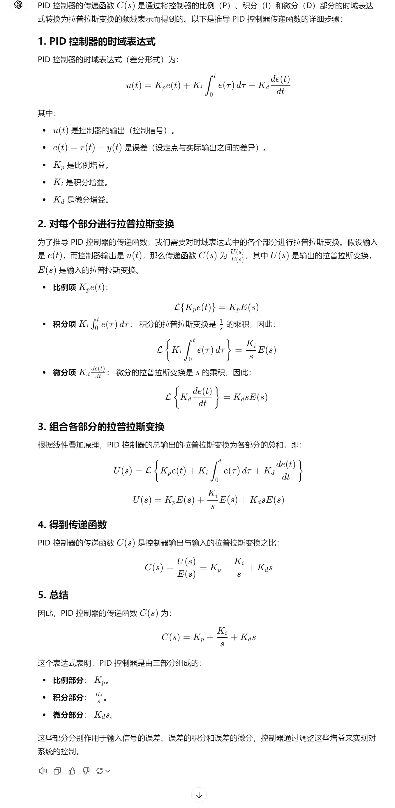 - 位置式 PID:直接计算控制量的绝对值,也就是说,控制器输出的是相对于目标值的绝对控制量。控制输出值是当前误差的比例、积分、微分的总和。